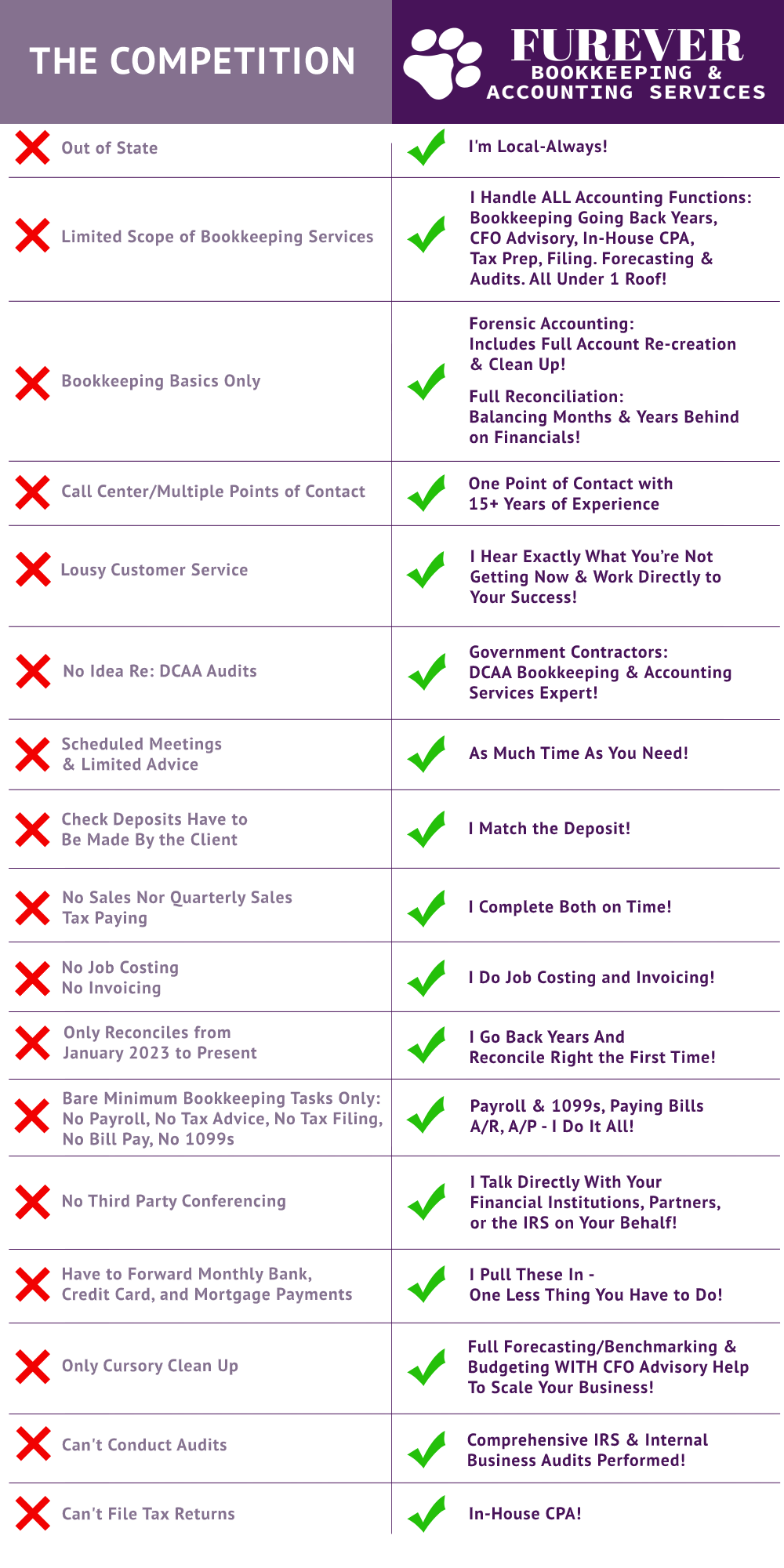 While the competition merely offers assistance with services, Furever Bookkeeping & Business Accounting Services’ one stop shop Custom Catch-Up Plus Package can include: Financial Advisory Services, Tax Advice, Facilitating the Filing of Income or Sales Tax Returns & Creating and Sending 1099’s for your Business – all via my In-House CPA.